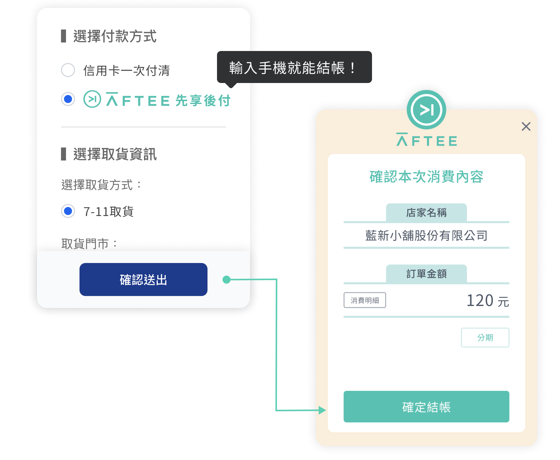 消費者結帳時選擇「AFTEE 先享後付」後,將會顯示 AFTEE 結帳頁,只要輸入手機號碼完成簡訊認證並確認金額即可完成結帳。