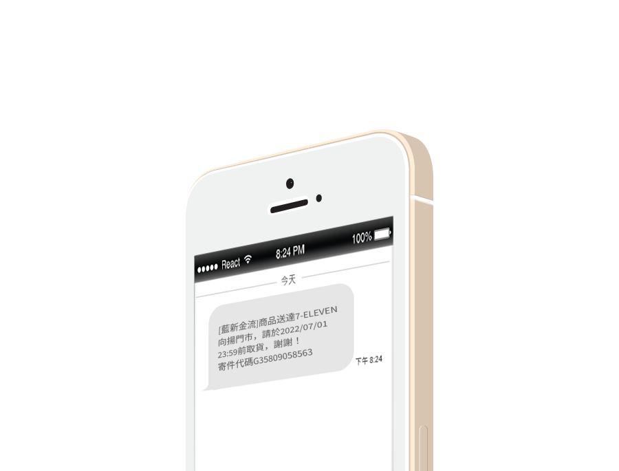 商品進到取貨門市後,藍新金流將會立即寄發取貨通知簡訊給消費者。